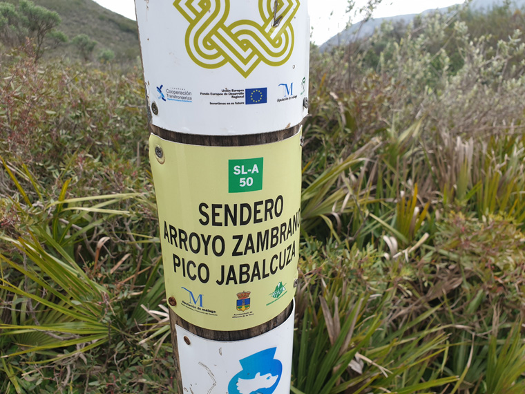 We followed a path which keeps close to the spine of the ridge. We arrived at the new Refugio del Canada, shortly followed by Albergue del Canada, both of which were shut. We presumed they have been built for walkers on the GR249, to avoid finding accommodation in Torremolinos or Benalmadena about 500m down the mountain. We would like to visit during the summer when they are open. The weather when we started out had been sunny and windy. But by now the wind had really picked up, the whole of the coast now obliterated by mist. At this point we had our coats, winter hats, and gloves on, and regretted wearing shorts.