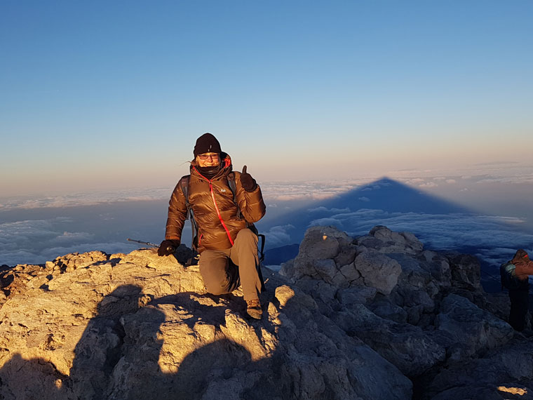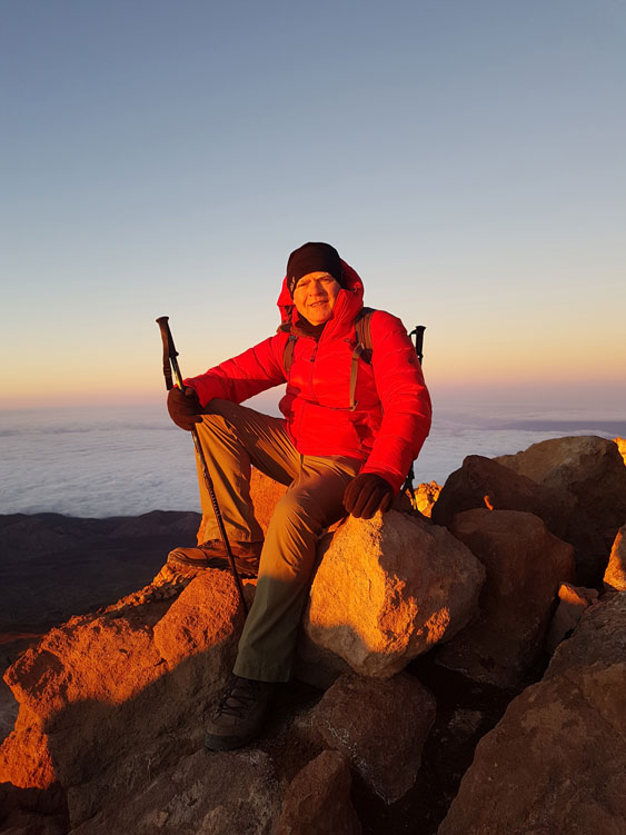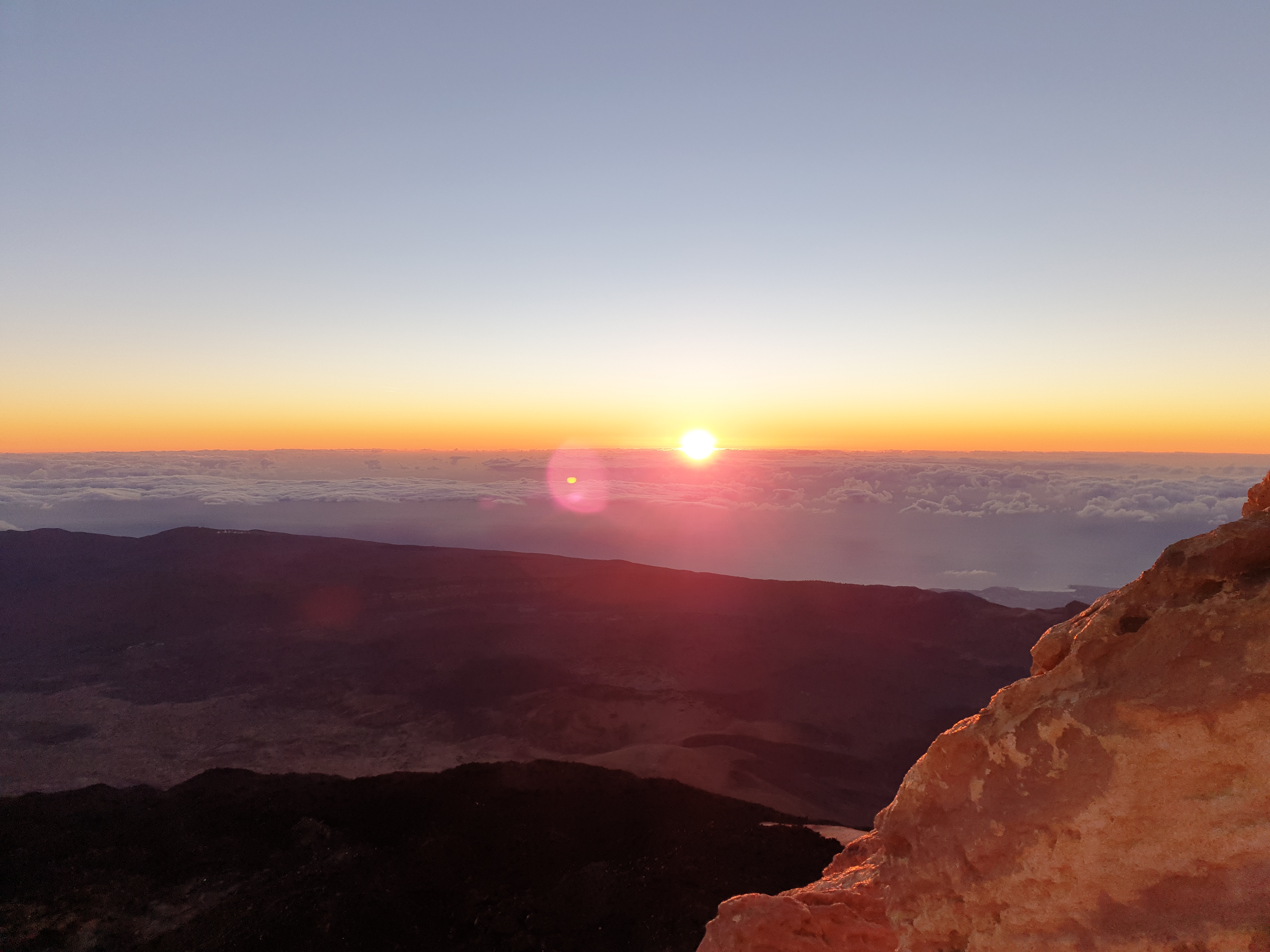 We summited at 7.20am, with the sun casting a shadow but not yet dawn. Sulphur was blowing around at the summit, creating a smell like bad eggs. The 50 or so people from the refuge gathered on the narrow summit, and watched the sun come up at 7.45am. It was a fantastic moment, we could see far down to the ocean. We were high above the clouds. It was very cold on top, minus 10 with the wind chill. Cold even with all our layers, wishing I had brought liner gloves, so the camera on the phone could be used with gloves on. We took many photos, everyone was happy to be there. We made a wish, and threw the pebble that we had brought with us from the beach into the steaming sulphur ponds. Due to its colossal size, Mount Teide is known to cast the largest sea shadow in the world.
