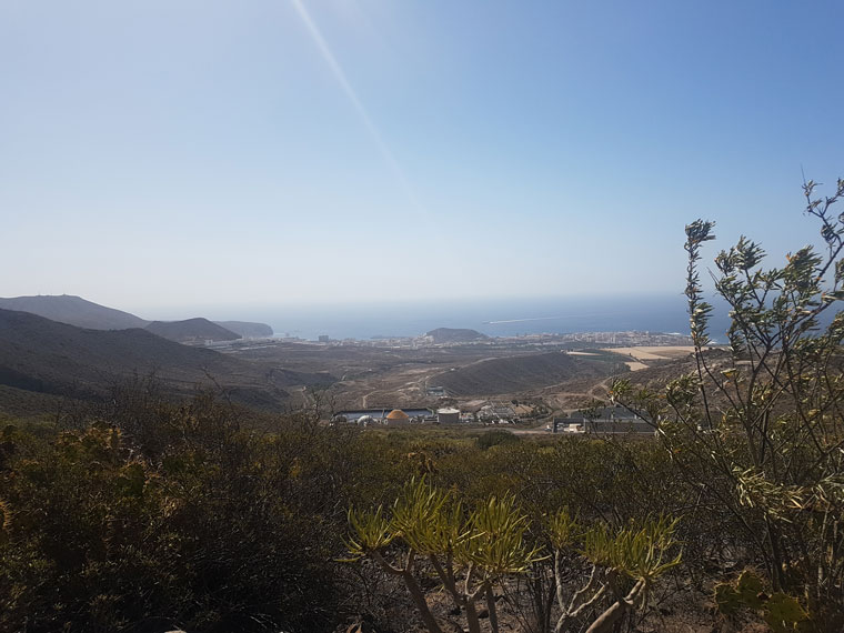 We started the walk by dipping our boots in the ocean, and collecting a pebble to take with us to the top of Mount Teide - similar to the start of the English Coast to Coast. We walked up through the town, calling at Mercadona supermarket in the shopping centre on the way. We walked up hill via Calle Galicia, through the housing estate, up a large flight of steps, eventually reaching an old donkey trail which leads from Adeje Pueblo to Arona. Turning right and following the obvious path through a couple of barrancos led us to Arona. The views are fantastic, overlooking Los Cristianos, Playa de Las Americas, over the Ocean to the island of La Gomera.