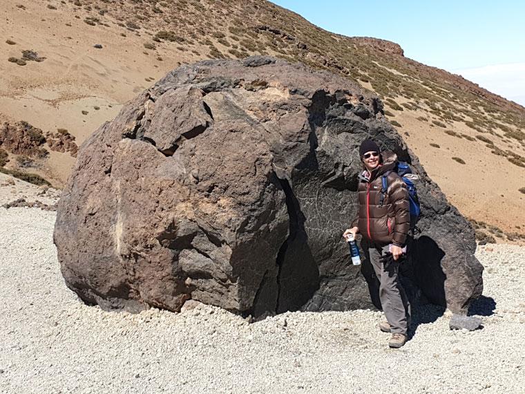 At 1pm we had our first view of Mount Teide just before the col It was absolutely stunning, looking resplendent in the sunshine. At the edge of the cauldron, it was suddenly windy and cold, and we put on our gloves, hats and spare coats. We were lucky to have such a beautiful clear day as rain had been forecast again. On descending it quickly warmed up. From the base of the cauldron wall, it is another 5km walk to the parador, arriving at 2.15pm.